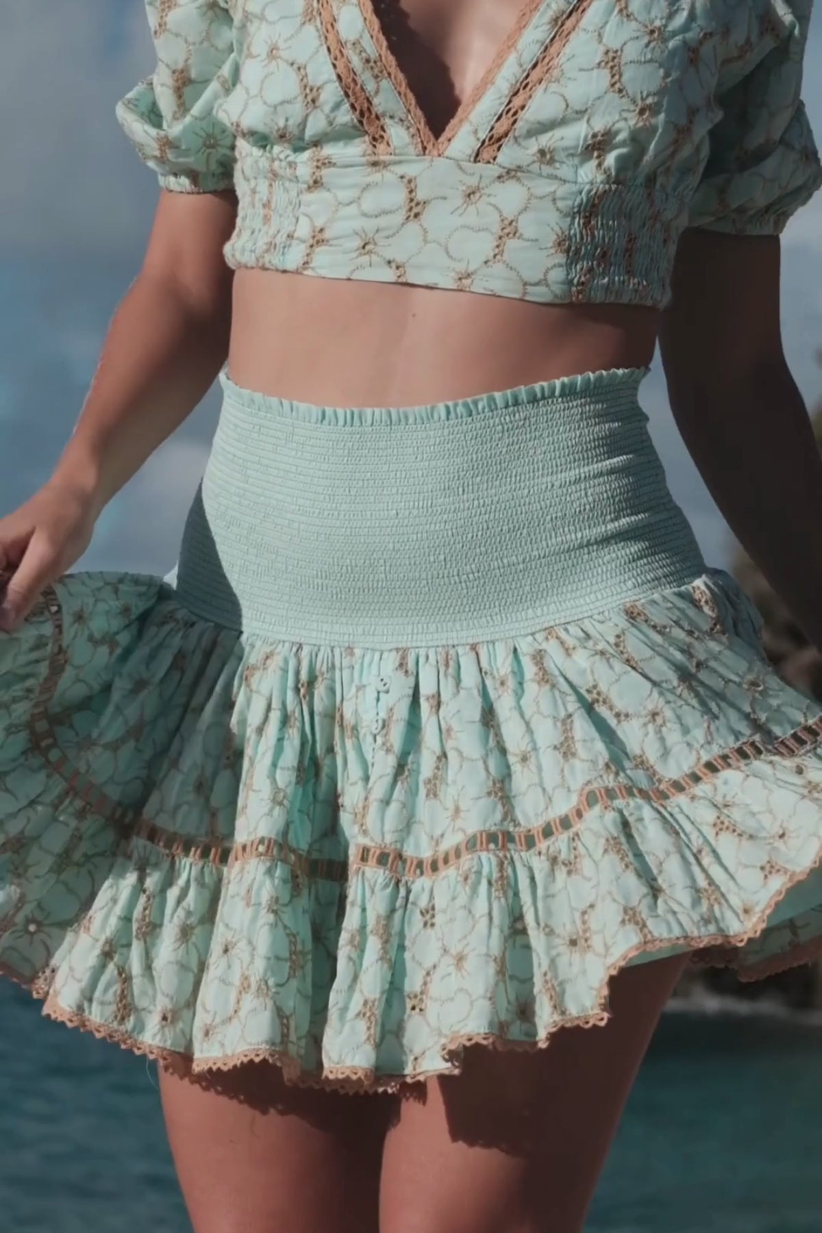 Summer vibes only! The Rosalia mini skirt is an ideal piece for warm, sunny days. This breezy flared mini skirt is crafted from beautiful cotton embroidered fabric accented with ladder stitch and button details. Designed for effortless wear, it features an elastic smock around the waist. We absolutely love the turquoise print that screams summer!