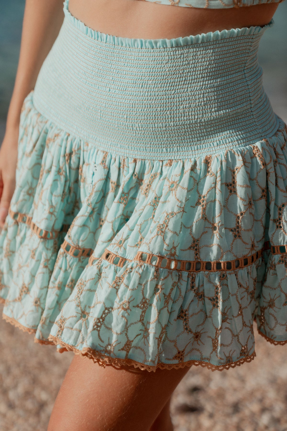 Summer vibes only! The Rosalia mini skirt is an ideal piece for warm, sunny days. This breezy flared mini skirt is crafted from beautiful cotton embroidered fabric accented with ladder stitch and button details. Designed for effortless wear, it features an elastic smock around the waist. We absolutely love the turquoise print that screams summer!