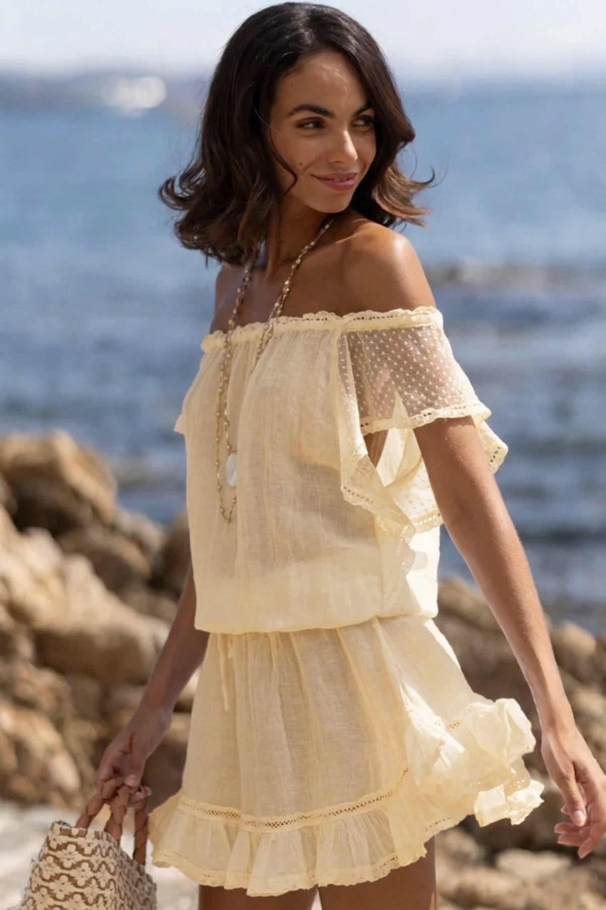 Delicate lace details grace the sleeves, adding a touch of romance, while elastic bands around the shoulders and waist ensure a flawless, comfortable fit. Light, flowy, and irresistibly feminine, this dress is just as stunning for a day in the city as it is worn as a chic beach cover-up.