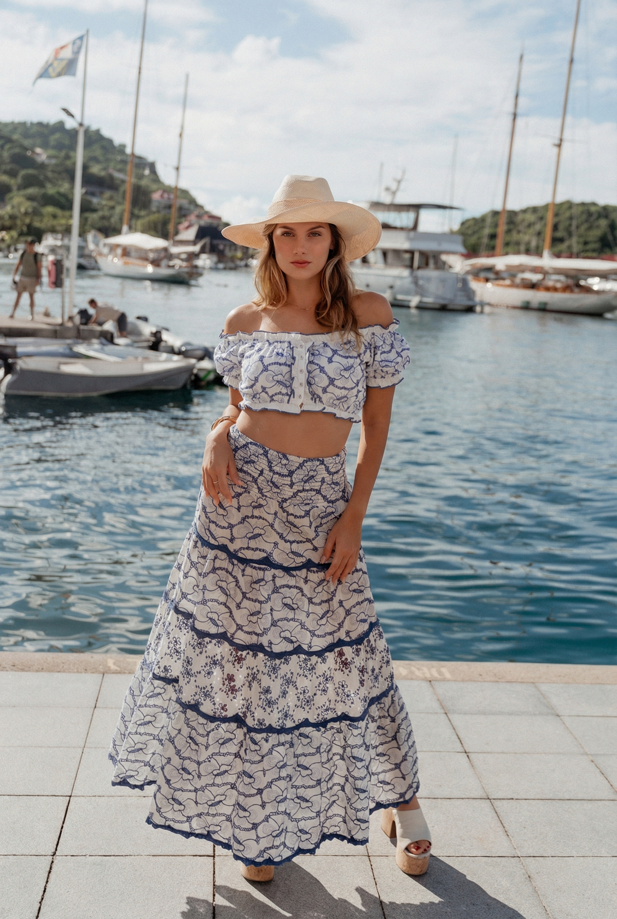 Ce haut présente des manches à épaules dénudées et de délicates finitions à volants. Observez de près les jolis boutons à l’avant. Il est doté de bandes élastiques pour s’ajuster à la poitrine et garantir un ajustement parfait. Cette pièce est idéale pour un look coordonné : portez-la avec nos mini jupes ou jupes longues assorties pour un ensemble entièrement brodé.