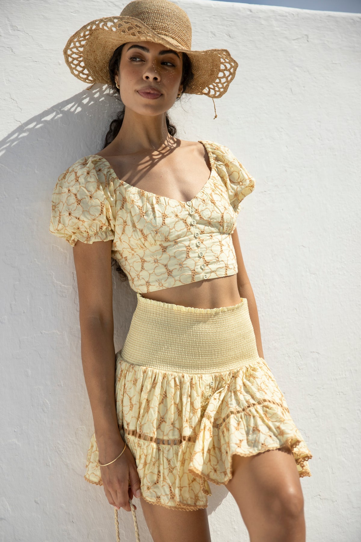 Ce ravissant top en coton brodé présente un smock élastique autour de la taille et d'élégants boutons sur le devant. Il est encadré de manches légèrement bouffantes pour une esthétique féminine. Polyvalent et facile à combiner, vous pouvez le porter avec notre mini-jupe assortie ou votre jean préféré.