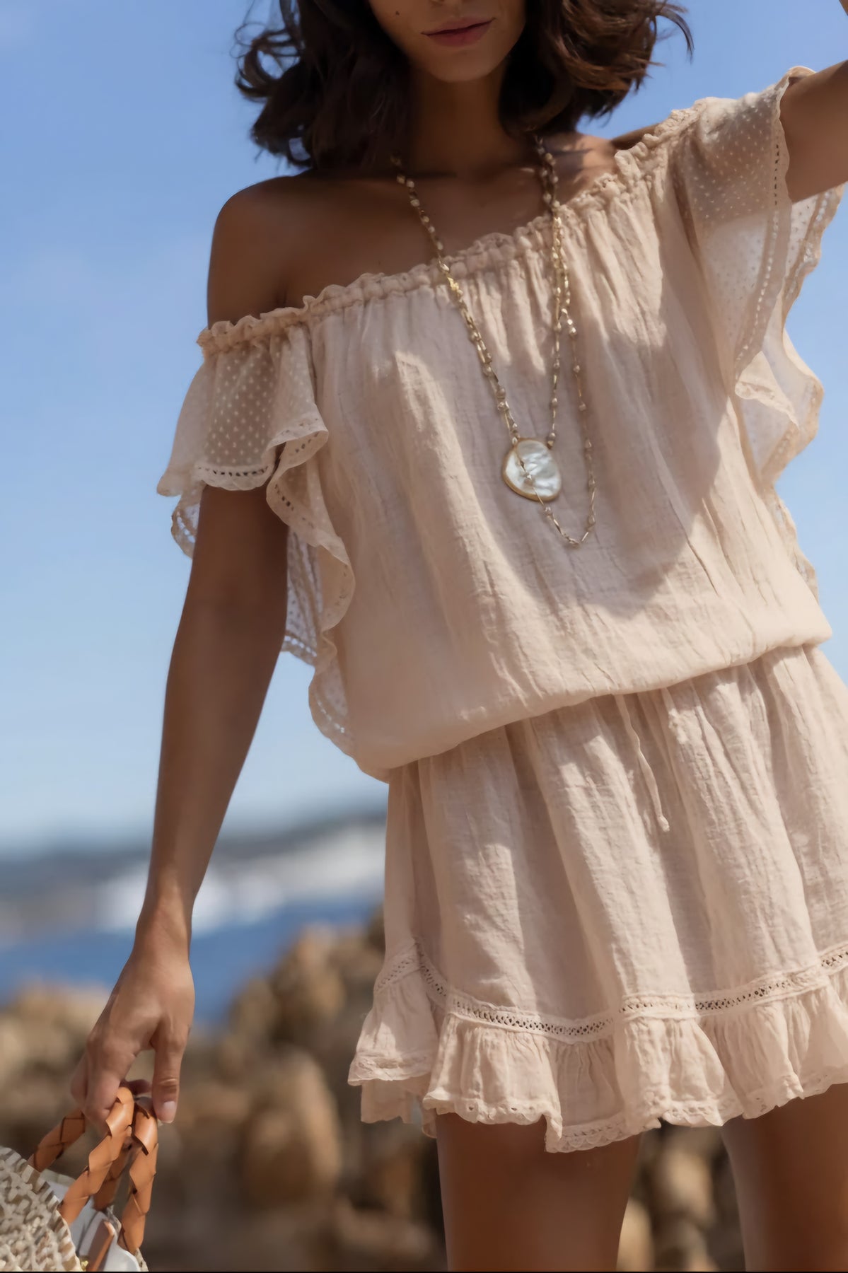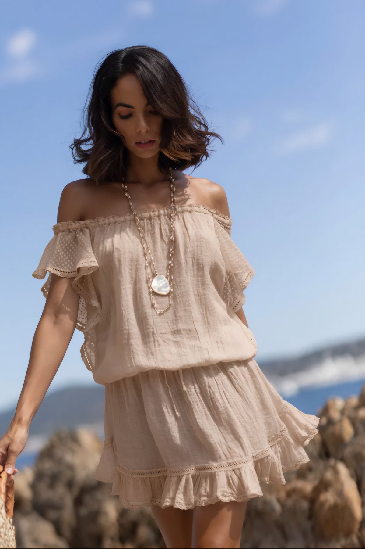 De délicates dentelles ornent les manches, ajoutant une touche de romantisme, tandis que les élastiques aux épaules et à la taille assurent une coupe impeccable et un confort optimal. Légère, fluide et irrésistiblement féminine, cette robe est aussi ravissante pour une journée en ville que comme paréo chic à la plage.
